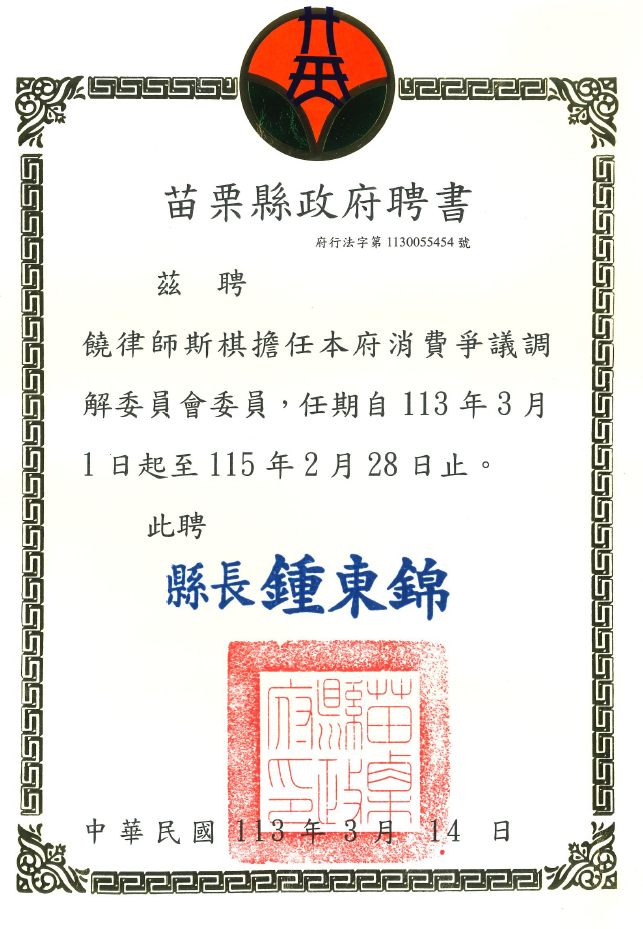 本事務所之所長饒斯棋律師,擔任苗栗縣政府「消費爭議調解委員會」委員。(1130301-1150228二年)