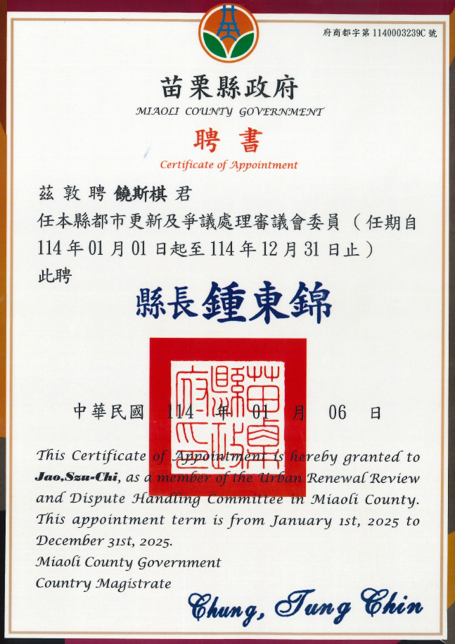 本事務所之所長饒斯棋律師,擔任苗栗縣政府「都市更新及爭議處理審議會」委員。(114年)