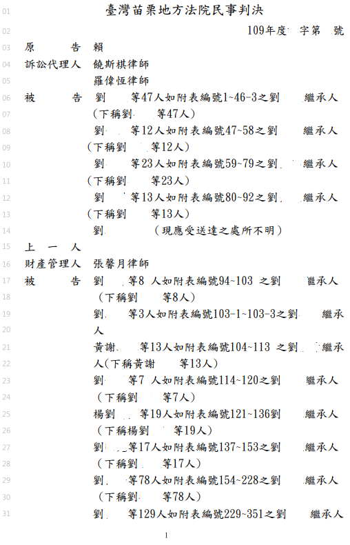 民眾名下之土地之使用分區為鄉村區,使用地類別為乙種建築用地,共有人有高達927名,且大部分之原始謄本登記共有人死亡,尚未辦理繼承登記。經委請饒斯棋律師向法院起訴請求判決「分割共有物」,事務所全體人員戮力找出共有人之繼承人並製作繼承系統表,無繼承人的部分則向法院聲請遺產管理人應訴,耗時將近兩年,最後法院依饒斯棋律師的主張:「兩造就系爭土地並無不能分割之限制,且亦無約定不能分割之情形,然因系爭土地共有人數眾多,原告無法與所有被告聯繫就分割方法取得協議,且系爭土地現況雖有部分地上物,惟大部分僅種植蔬菜、苗圃或閒置狀態,如採原物分割方式並無困難,客觀上亦能就原物加以分割,況本案除原告外其餘共有人或因應有部分比例較少、或對系爭土地當前並無利用之計畫,原告為增進系爭土地之經濟利用價值,為此依民法第823條第1項等規定訴請部分繼承人辦理前揭繼承登記後,依如附圖所示之原物分割方案(下稱原告方案)分割系爭土地,原告方案並保留L型道路由兩造共有,並接往鄰地同段441地號土地上之馬路對外聯絡,可確保兩造土地分割後通行無礙」,而依原告之主張分割方案判決。