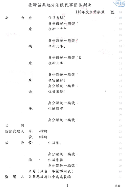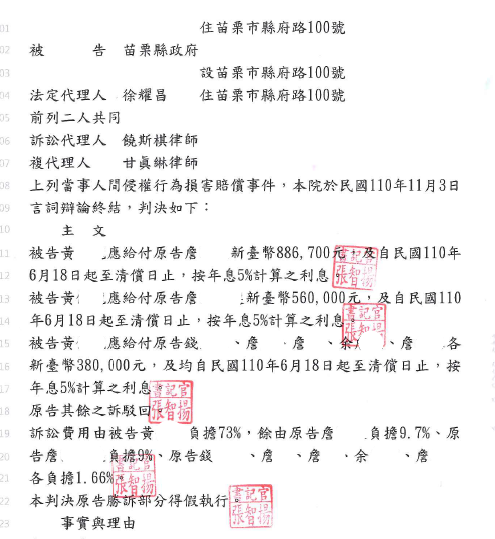 民眾起訴主張:「苗栗縣政府為A男之監護人即為法定代理人, A男駕駛機車,以致肇事,認為苗栗縣政府應與A男負連帶損害賠償責任。」,苗栗縣政府委任饒斯棋律師擔任訴訟代理人,律師幫其抗辯A男無肇事責任,且主張依監視影像及竹苗區車禍事故鑑定委員會均足以證明A男非直接肇事之人,應無任何過失,經法院審酌後認定A男及苗栗縣政府均無任何賠償責任。