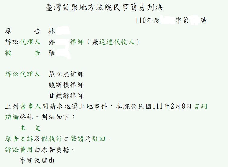 民眾主張使用的建物係其父親向000地號土地之地主租地後建照後使用迄今,沒想到原地主死亡後其繼承人向法院起訴主張:「系爭建物係原地主興建而由其原始取得,並僅出租予民眾父親至其逝世為止,惟民眾父親逝世後,即由民眾一家居住占用不返還,爰類推適用民法第767條第1項規定,請求民眾騰空遷讓系爭建物」,經民眾委任本律師事務所後,幫民眾提出抗辯:「系爭建物係其父親向000地號土地之地主租地後原始起造,因而取得系爭建物事實上處分權,其其父親逝世後,由民眾及其他人繼承,地主主張系爭建物為其所有,自屬無據;又原地主與其父親就租賃000地號土地並未約定租賃期限,應認當事人真意係租至系爭建物不堪使用為止」,經律師請求調閱系爭建物之稅籍證明書及稅籍底冊,足證該建物係於55年1月興建完成、55年2月起課房屋稅,納稅義務人為其父親,並無變更,再調取該電號用電資料後,該電號係於55年10月1日裝表供電,用電戶名為其父親名字,故法院認定本律師的抗辯有理由,而為駁回地主之起訴,為民眾保住房屋。