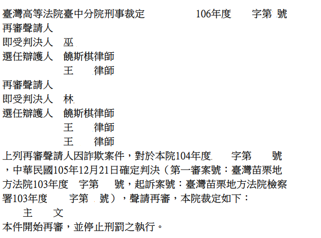 再審聲請人因詐欺案件,第一審臺灣苗栗地方法院103年度易字第000號判決無罪,檢察官不服而上訴, 第二審再未傳喚證人或有調查新事證之情況下逕行以臺灣高等法院臺中分院104年度上易字第000號判決改判被告有罪確定,然該確定判決明顯有嚴重瑕疵,遂委任饒斯棋律師聲請再審,經饒斯棋律師再次檢閱全部卷宗,並再提出聲請人000所提出簽辦公文稿,係屬判決確定前已存在而未及審酌調查之證據,讓審理之法院認可此屬刑事訴訟法第420條第1項第6款規定中所謂之新證據,且該新證據與先前之證據綜合判斷,雖未至鐵定翻案、毫無疑問之程度,但已能產生合理之懷疑,而有足以推翻原確定判決所認事實之蓋然性,認定饒斯棋律師所提出上開再審事由,為有理由,應為開始再審之裁定。又本件既經准予再審之裁定,因聲請人000所受刑之宣告均係不得易科罰金、亦不得易服社會勞動之刑,為避免聲請人000因刑之執行而受有難以回復之損害,聲請人000原受判決確定之刑罰,應併停止其執行。最後經臺灣高等法院 臺中分院 106 年度0字第 000 號刑事判決維持委任人無罪判決而確定,還被告清白。