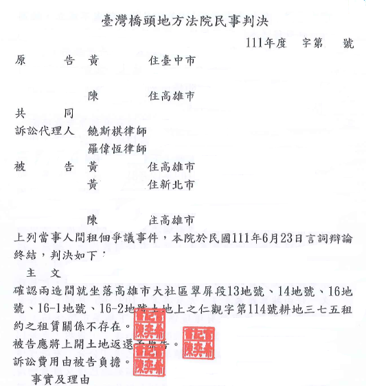 佃農未耕作許久致耕地雜草叢生,並未有任何農作物,地主更接獲環境保護局通知耕地未妥善管理維護致雜草叢生已逾50公分,有礙環境衛生及市容觀瞻,易衍生孳生登革熱病媒源已違反廢棄物清理法,當事人委請本律師起訴依減租條例第16條第1項、第2項規定,系爭耕地租約即因不自任耕作之情事而全部歸於無效等事由,經本律師協助整理當事人現場勘查並蒐證照片、影片、歷年航照圖及聲請傳喚公所之承人員、環保局之承辦人員等到庭作證,證明佃農並未於系爭耕地自任耕作,而是交由第三人代耕,並無親自耕作或綜理任何農事,另其他共同承租人亦無耕作為此起訴請求:㈠確認原告與被告間就系爭耕地上之耕地三七五租賃關係不存在。㈡被告應將系爭耕地返還予原告。,法院採信本律師之意見及證人之證詞,再參酌系爭耕地租約係由被告數人共同擔任承租人,系爭耕地租約之雙方當事人就系爭耕地並未約定被告各自使用之範圍,其他被告未出面開庭對本律師之主張視同自認,堪信其他佃農就系爭耕地確有未自任耕作之情事,系爭耕地租約全部歸於無效,不因其中一位佃農有無自任耕作而有異。從而,法院判決系爭耕地租約因部分佃農有不自任耕作之情事而全部歸於無效,為當事人勝訴之判決。