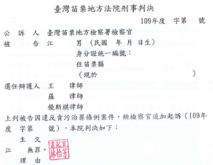 檢察官起訴:「緣苗栗地檢署檢察官於偵辦被告甲○○任鄉長涉嫌公務員對於職務上行為收受賄賂之罪時,發現被告甲○○於民國105年1月1日起至107年12月31日止之3年期間,使用之中華郵政帳號000000000號、臺灣銀行帳號00000000號之帳戶,以現金、無摺存款、匯款至上揭金融帳戶之金額共計2188萬2831元,經扣除被告甲○○收取之賄款85萬元部分,及自所投資之00公司獲有3年共計紅利750萬元,被告甲○○尚有1353萬2831元之現金增加,與其收入顯不相當。而被告甲○○對於上開來源不明之財產增加,無法提出合理說明。因認被告涉犯貪污治罪條例第6條之1之公務員財產來源不明罪嫌等語」,經當事人委託本律師幫其抗辯:「尚未擔任鄉長前,就已經有投資餐廳、2家公司等,在大陸蘇州、廈門也有投資;伊這些錢都有合法、明確來源,包含伊介紹清潔公司工作給兄弟姊妹,後來因伊擔任鄉長,持股不能超過10%,所以變成公司顧問,伊胞弟乙○○陸續將公司獲利作為佣金轉給伊,當然其中還有向友人借款,金額都是好幾百萬元,另外還有會錢、地下簽賭、伊投資餐廳或私人公司的錢進出,但伊與伊配偶1年收入絕對不只幾百萬元等語。檢察官逕將部分被告提出來源證明之金額扣除,但被告帳戶內款項也都是有人存入,並非來源不明,被告已盡其說明義務;帳戶內款項並非均為合法收入來源以外之財物;依被告經營2家清潔公司近20年,若再加計其配偶擔任業務執行經理之收入,以及考績、年終獎金、投資獲利,合計金額甚為可觀,在扣除家庭生活及子女教育等開銷後,其累積存款難認有何不合情理之處;且依被告提出之資料,其已說明來源之財產金額加總已超過檢察官所指來源不明之財產金額1,300餘萬元,依檢察官所舉證據,尚難認符合本罪3年內「財產增加程度與收入顯不相當」之要件。」法院經審酌本律師提供之相關證據及證人後認定:「衡諸被告於上開區間,其公職薪俸及其他合法收入,合計約2,329萬5,341元之收入狀況,則追加起訴意旨所指被告上開2帳戶內2,188萬2,831元之款項增加,與其收入相比較,是否足認為「顯不相當」,誠非無疑」、「對照上開區間前後與上開區間內,被告上開2帳戶之款項存匯情形,既未見有何明顯異常變化,亦仍不乏以被告自己或他人名義現金存款或跨行匯款者,要難憑此遽認被告於上開區間,已有與其公職薪俸及其他合法收入不相稱之金錢資源或財產之顯著增加,而合於前揭貪污治罪條例第6條之1所定「財產增加與收入顯不相當」之要件,揆諸前揭說明,自難逕認被告對於財產來源之說明義務已經發生」、「從而,本件被告就被指來源可疑之財產尚不負說明義務,自不生是否違反說明義務之問題,無從成立貪污治罪條例第6條之1之公務員財產來源不明罪。」,最後判決被告無罪。