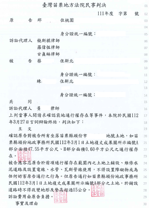 民眾陳稱其所有之土地為袋地,附近之地主不讓其通過及設置管線,經委任饒斯棋律師後幫其起訴主張:「原告為000地號土地之所有權人,被告為系爭土地之共同共有所有權人,原告之土地四周為他人土地所圍繞,屬與公路無適宜聯絡之袋地。又原告之土地前方之000地號土地已興建房屋,通行至聯外道路損害最小之方法為藉由系爭土地通行。是原告主張按附圖一所示部分通行系爭土地,此為損害最小之處所及方法,因原告之土地為山坡地保育區之丙種建築用地,如此始可充分發揮土地之經濟效用。原告之土地為袋地,顯非通過他人之土地,不能設置電線、水管、瓦斯管或其他管線,且需開設道路方能通行。又通行之目的係使土地與公路有適宜聯絡,自有在通行範圍鋪設路面之必要;另原告之土地其使用類別為丙種建築用地,日後得供建築使用,有於通行範圍內埋設電線、水管、瓦斯管等基礎設施之必要。則被告應容忍原告在通行範圍內之土地鋪設路面、管線,並不得阻礙原告通行。」,經法院審理及現場勘驗後,亦認同饒斯棋律師之主張,判決理由為:「原告通行附圖一所示被告所有之系爭土地,其通行之面積較小,且無需破壞地形、地貌,且將來被告使用系爭土地,亦可由附圖一所示之部分通行,對被告並無不利;如通行附圖二所示土地,其通行之面積較大,且需破壞47地號土地之地形、地貌。是應以通行附圖一所示之方案為損害周圍地最小之方法」、「有通行權人於必要時,得開設道路,民法第788條第1項前段定有明文。且土地所有人取得必要通行權,或得開設道路時,通行地所有人或其他占有人均有容忍之義務,倘予阻止或為其他之妨害,通行權人自得請求予以禁止或排除。原告通行之目的,係為在其所有土地上興建建築物居住,自有人員、車輛必需通行,而有鋪設道路及設置電線、水管、瓦斯管線之必要,為維持通行之目的,原告請求被告應容忍其通行,且容忍其在通行範圍開設道路並鋪設、維修水泥道路,及設置電線、水管、瓦斯管線使用,並不得設置障礙物或為任何妨害原告通行之行為,亦應予准許。」,判決民眾勝訴,順利幫民眾解決爭議。