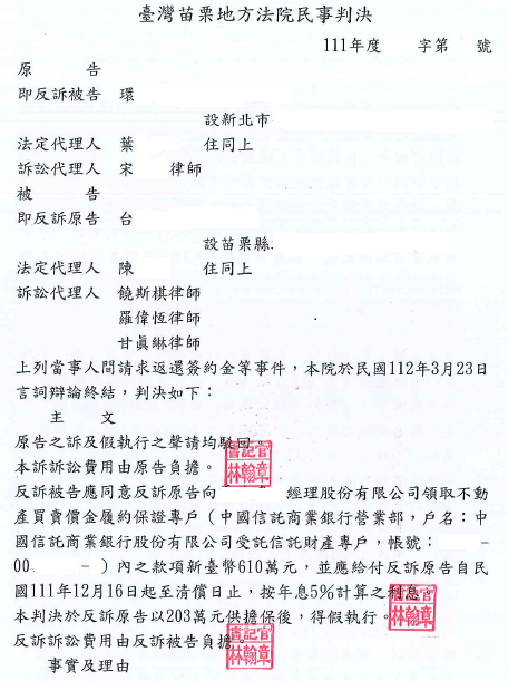 當事人公司出售廠房,詎料買方主張其未提供排水設施因而要求解除契約,並要求當事人公司負違約金,經委任饒斯棋律師,先幫其答辯:「被告就系爭契約之義務僅擔保系爭土地得建築,又系爭土地已連接現有巷道得已指定建築線合法申請建照,依通常交易觀念,已具備可為建築之效用,又況,兩造並無合意被告應施作排水設施之特約,足見系爭土地並無何物之瑕疵,故被告交付無權利瑕疵且可得以建築使用之系爭土地,即屬依債務本旨為給付;是原告請求解除契約,並無理由」,並一併幫其提起反訴主之:「反訴被告未依系爭契約給付買賣價金,經反訴原告依系爭契約第3條第4項約定以存證信函催告反訴被告應於函到10日內給付第二期款628萬,否則以該函作為解除契約之意思表示,並依系爭契約第8條第2項沒收買賣價金,詎反訴被告仍未於期限內履行付款,故反訴原告依該函解除系爭契約,並沒收反訴被告已給付之610萬元價金作為違約金」,法院傳喚證人及調查證據後認同饒斯棋律師之主張,判決理由認定:「在得以建築之土地上申請建築執照,依建築法第32條及苗栗縣建築管理自治條例第11條、第12條,固應檢附工程圖樣包括新舊溝渠及出水方向,且建築物之排水溝渠與出水方向應配合該地區之排水系統設計(有苗栗縣政府函文在卷可參),惟此乃興建建物之申請條件,而非系爭土地本身得否建築使用之問題。系爭土地既符合可供建築之資格,除非買賣雙方就系爭土地將來興建建物所需之條件有特別約定由賣方負責,否則就申請建照之要件,本應由買方(或建物興建申請方)自行處理。」、「原告於系爭契約簽立前,既已確認系爭土地現有溝渠的使用狀況,且於契約磋商期間亦未提出或確認現有溝渠可否合法使用,足見原告已同意系爭土地之現況交付,亦難認被告有何知悉無排水設置之瑕疵而未告知之不完全給付情事」、「系爭契約第3條第2項約定反訴被告最遲應於111年7月10日將第二期款628萬元匯入系爭履保帳戶,另同條第4項則約定反訴被告如有遲延給付價金之情事,若逾10日仍未配合給付該遲延價金,再經反訴原告定期間催告仍不履行時,反訴原告有權解除系爭契約,而本件反訴被告於第二期款清償期屆至(111年7月10日)後未給付價金而陷於遲延給付,復再逾10日仍未給付價金,經反訴原告於111年9月10日以頭份尖山郵局第21號存證信函再定期催告反訴被告應於10日內給付第二期款項,如逾期未履行,則以該函作為解除契約之意思表示,惟反訴被告仍未於期限內履行付款義務,揆諸前開說明,解除契約意思表示之條件已成就,系爭契約自經反訴原告合法解除。故請求反訴被告應同意反訴原告向僑馥建經領取系爭履保專戶內之款項610萬元,及給付反訴原告自111年12月16日(即反訴起訴狀繕本送達翌日)起至清償日止,按年息5%計算之利息(民法第229條第2項、第233條第1項前段、第203條),即屬有據」為當事人公司取得全部勝訴判決,保障其權益。