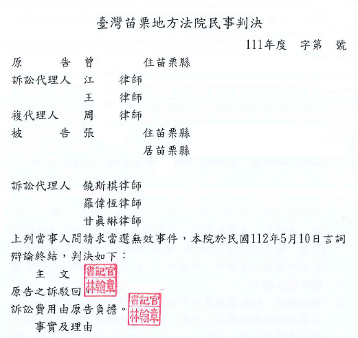 當事人當選後,落選之候選人主張當選無效,對其起訴:「被告之父係替被告從輔選人員,為求當選,竟共同交付賄賂自110年11月起迄111年9月間,分別向訴外人致贈禮品【價值新臺幣(下同)180元至220元不等】,作為允諾支持被告之對價。而有選罷法第99條第1項之賄選行為,被告應有共同參與,或授意,或同意等不違背其本意,而推由為賄選行為,爰依同法第120條第1項第3款規定,提起本件當選無效之訴等語」,經委任饒斯棋律師後,饒律師閱卷及討論後替其答辯主張:「被告並無與奇負就系爭選舉期間以餽贈禮品之方式對有投票權之人行賄。蓋奇負現為社區發展協會之幹部,且經營餐廳,每年本會訂購禮品贈送親友、社區發展協會幹部等,作為例行性年末送禮,非僅有選舉始為之,實屬一般性之人情贈禮。又贈送禮品之行為係於110年11、12月間,距系爭選舉日期將近1年,亦未有任何選舉文宣隨同贈送,或同時有任何選舉請託,難認主觀上有何行賄之犯意,更無從認定被告與奇負共同基於以禮品為代價而使有投票權之人為一定投票行使之犯意聯絡,且奇負所為贈送禮品等行為業經臺灣苗栗地方檢察署為不起訴處分,並經臺灣高等檢察署臺中檢察分署駁回再議而告確定,原告起訴認被告與奇負有共同賄選買票之情事,核屬偏頗與臆測之詞,顯無理由等語」,經再傳訊相關證人詰問後,法院認定原告請求宣告被告系爭選舉之當選無效,為無理由,應予駁回。