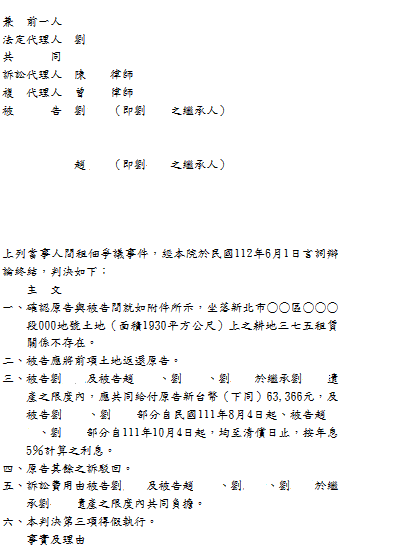 當事人委託饒斯棋律師起訴:「兩造現為系爭耕地租約之出租人及承租人。而委託人於勘查祖先所留下系爭耕地時,卻發現有被告以外之第三人於現場耕作,詢問左右鄰里,方得知因承租人即被告另有工作,系爭耕地已是交由第三人進行耕作將耕作期間種得之農作部分銷售、部分送予給被告食用。此有錄音譯文可資佐證。除被告劉東龍外,其他被告000、000遠在國外根本未曾至系爭耕地實際耕作過,而000為高中生平日要上學,亦不可能至系爭耕地耕作。被告四人均有未自任耕作之情。被告欠租已達二年,前分別以存證信函以前開事由併依耕地三七五減租條例第17條第1項第3款規定向被告終止租約,自屬發生終止耕地契約之效果,原告並依民法第767條第1項前段、第263條、第259條第1項第1款規定請求被告返還系爭耕地。」經饒律師請求傳訊證人調閱入出境資料後,法院判決認定:本件被告於110年未自任耕作、其餘被告則始終未曾自任耕作,既已認定如前,則兩造間系爭耕地租約應自被告就110年第一期稻作未自任耕作時起,歸於無效,並為判決主文:「一、確認原告與被告間就如附件所示,坐落新北市○○區○○○段000地號土地(面積1930平方公尺)上之耕地三七五租賃關係不存在。二、被告應將前項土地返還原告。三、被告於繼承劉敏郎遺產之限度內,應共同給付原告63,366元,及按年息5%計算之利息。」為當事人勝訴判決。