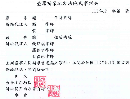 原告起訴主張:「被告為苗栗縣苗栗市第12屆市民代表之候選人,被告在本次選舉期間於社區發展協會活動中心以餽贈價值約199元蛋糕之方式行賄,且證人亦證稱蛋糕是由被告發送、亦稱被告當時穿著市民代表衣服,證人稱被告於活動現場有請大家支持他連任等拜票等語,已構成公職人員選舉罷免法(下稱選罷法)第120條第1項第3款之當選無效事由。爰提起本件訴訟,請求判決被告當選無效。」經當事人委任饒斯棋律師後,饒律師聲請調閱刑事卷宗並聲請傳訊相關證人到庭作證主張當事人並無任何賄選情事,經法院審理後亦認定:綜合證人之陳述,可知111年10月3發送系爭蛋糕之情節為:被告於載送系爭蛋糕至活動中心當時,已明確告知值班之000「系爭蛋糕係000所贈」,且在場發送蛋糕之志工亦告知蛋糕為關懷老人、重陽節之贈品,被告亦無在場發表競選言論、拜票、贈送選舉文宣禮品等行為。基此,系爭蛋糕係第三人出資製作,做為敬老之公益贈品,被告僅係載送至活動中心交由工作人員分發,過程中被告並無競選言行,領取蛋糕者主觀上亦認知蛋糕為重陽節禮品,而非被告參與系爭選舉之贈禮。非屬選罷法第99條第1項所指之「賄賂」或「不正利益」至明。準此,本件自不得僅憑被告有發送系爭蛋糕行為,即推論其構成選罷法第99條第1項之投票行賄罪,故原告依選罷法第120條第1項第3款規定提起本件當選無效之訴,顯無理由,應予駁回,為當事人勝訴判決。