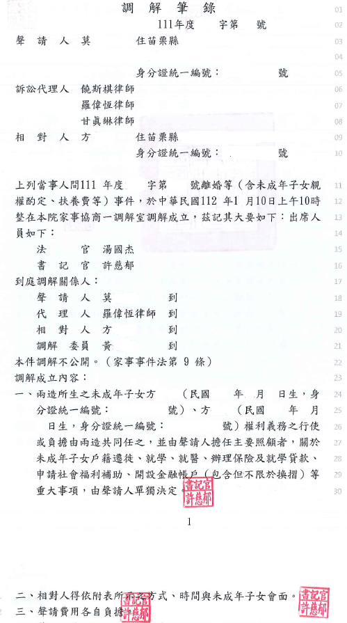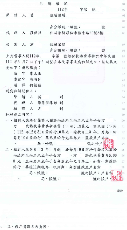 本件當事人主張對造婚後即染上賭博之惡習,未正常支付家裡之生活扶養費用,於生意失敗後,亦未再找尋新工作,仍持續沉迷賭博,致使精神及情緒狀態不佳,無故懷疑當事人有外遇及時常辱罵當事人,而未成年子女的所有扶養費用皆由當事人單獨支付,對造對於家庭生活之維持,自始均不聞不問等情,委請本事務所提告離婚並請求扶養費,經法院調解離婚成立、就對造應給付扶養費用和解成立。