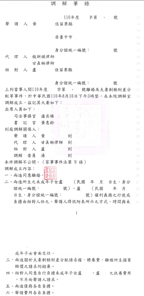 本件當事人主張對造婚後無穩定工作,未給予當事人維持家用及子女教養之費用,是以兩造多年來經常為家庭生活費用發生爭吵,而被告性情亦十分暴躁,情緒激動時,即發生對造辱罵毆打家暴當事人等情事,委請本事務所提告離婚,經法院調解離婚成立。