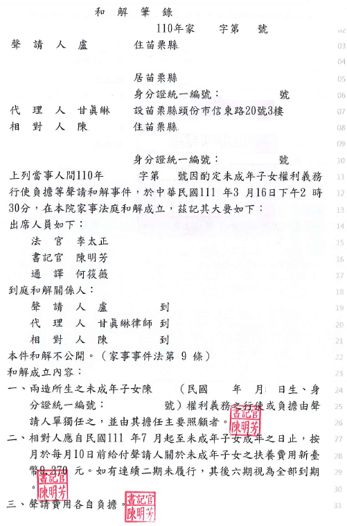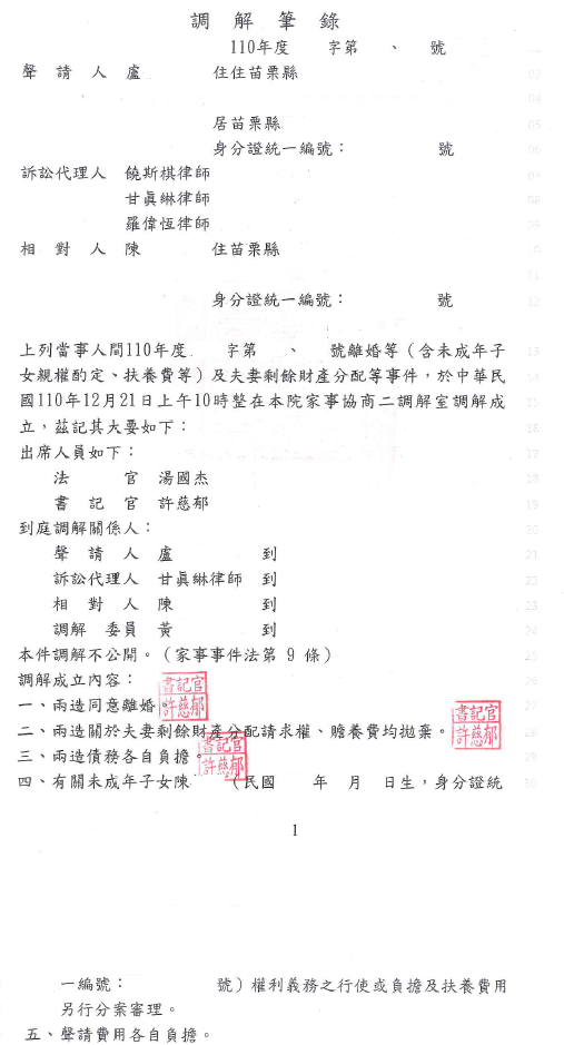 本件當事人主張對造婚後有酗酒惡習,常因情緒失控而辱罵毆打當事人及子女等情事,造成當事人及子女生活在家庭暴力的恐懼之下等情事,委請本事務所提告離婚、子女監護權及扶養費,經法院調解離婚成立,取得子女監護權,對造應給付扶養費用。
