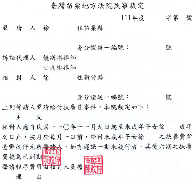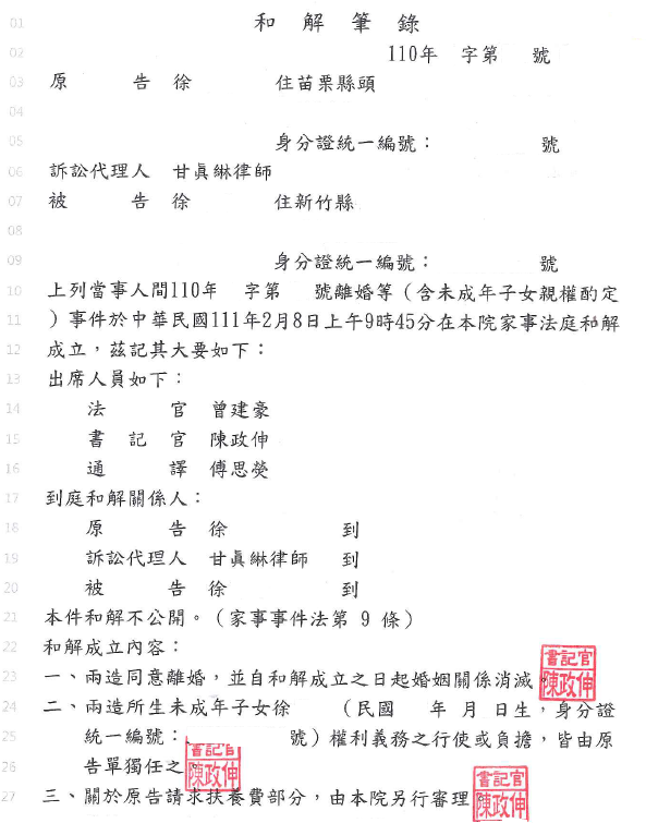 本件當事人主張對造婚後情緒控管不佳,且有酗酒之惡習,常因情緒爆走而與原告發生爭執,於爭執期間亦有暴力毆打原告及以不當言語罵原告,並恐嚇威脅當事人造成當事人極大的精神上壓力等情,委請本事務所提告離婚、子女監護權及扶養費,經法院調解離婚成立,取得子女監護權,對造應給付扶養費用。