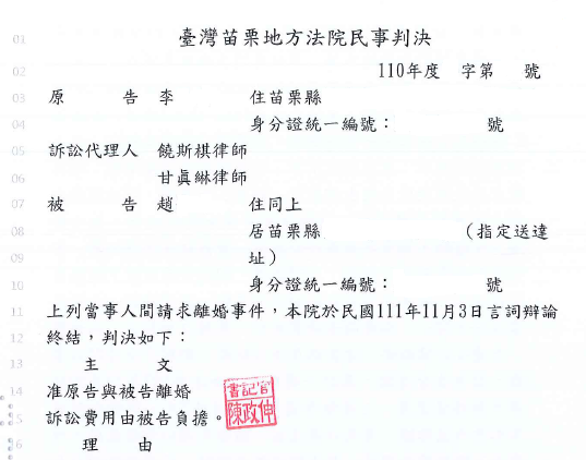 本件當事人主張對造婚後經常發生爭執,互相口出惡言,對造多次提議離婚,爭吵後經常與當事人分房而睡,且對造長期在住處堆放雜物,影響居住環境之清潔,兩造經常因此起爭執等情,委請本事務所提告離婚,經法院判決准予離婚。