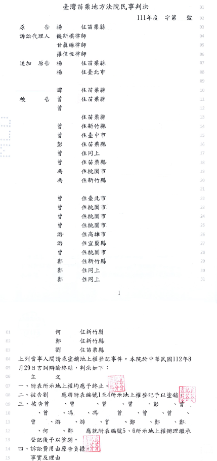 當事人所有土地前分別為000、000(已於50年3月20日死亡)於38年間設定附表所示地上權。惟系爭土地上之建物已因配合道路拓寬工程而拆除或拆毀大部分結構,無法遮風避雨,經委任饒斯棋律師起訴主張:「附表所示地上權迄今已存續超過74年,倘繼續存在,將嚴重影響系爭土地之利用,有礙所有權人之利益,爰依民法第833條之1、第767條第1項規定為請求」,經法院審理後認定:「系爭土地經本院履勘,確認其上已無000所興建建物存在,被告000承繼自000之建物亦已因道路拓寬工程而結構遭破壞,無法遮風避雨供人使用,現為荒廢狀態,再參酌附表編號1、2所示地上權雖有約定地租,但地上權人實際上已長年未繳納,此為兩造所不爭執。綜合考量上揭情事,認附表所示地上權倘繼續存在,勢必有礙所有權人對系爭土地之使用,進而有害系爭土地之經濟價值,應予終止為宜。從而,原告依上揭民法第833條之1規定請求本院終止附表所示地上權,核屬有據。」為當事人勝訴之判決。