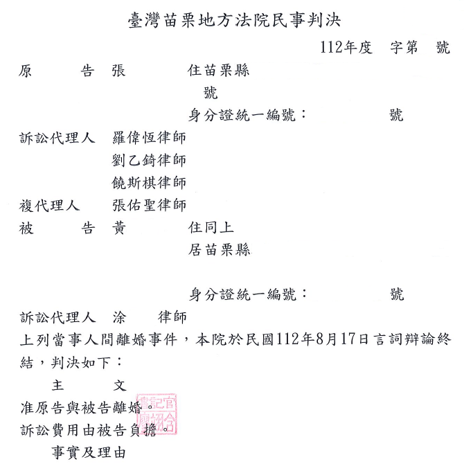 當事人關於請求離婚事件委任饒斯棋律師,經饒律師幫其起訴主張:「雙方於57年12月30日結婚,婚後育有2子,婚後家庭之生活費用、子女學費皆由原告獨自負擔,且被告經常無故離家兩三天後又突然出現,在外花天酒地並與多位女子有不正當交往關係,嗣後被告於82年間突然無故離家迄今30年,被告對於原告、子女及同住之被告母親不聞不問,被告之父母亦是由原告照顧到百年,被告對家庭應負擔之生活費用完全未支付,全由原告一人獨自負擔。從而,兩造分居迄今已逾30年,被告甚仍與其他女子同住,顯見被告有惡意遺棄原告之情且對原告已無忠誠之心,兩造婚姻有無法繼續維持之重大事由,分別構成民法第1052條第1項第5款及同條第2項得請求判決離婚之規定。」,經法院傳訊兩造兒子到庭作證及斟酌當事人所提相關物證,法院判准當事人離婚,為其爭取權益。