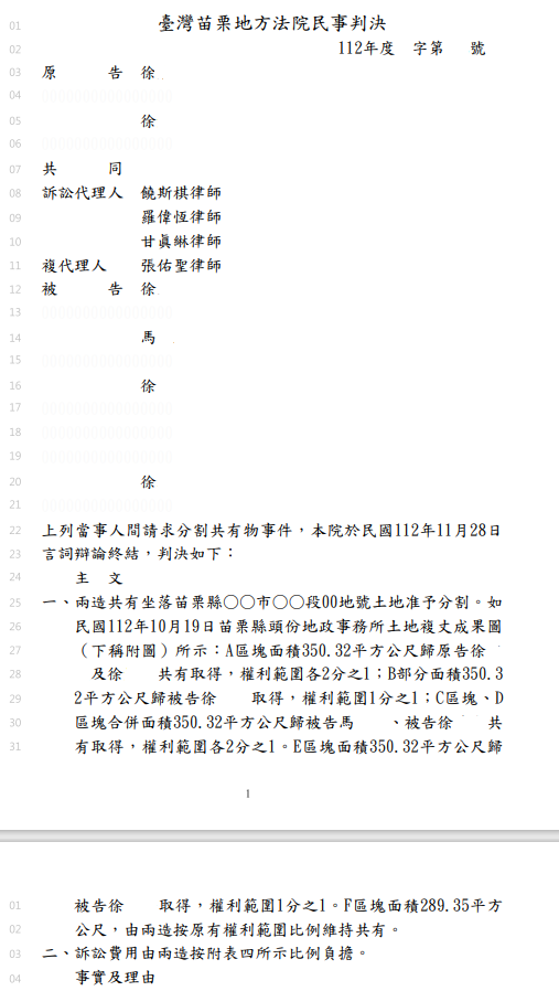 當事人因土地與他人共有,而當事人於土地上有搭建鐵皮屋並種植蔬菜使用,與其他共有人無法協議分割,因此委請饒律師依民法第823條、第824條規定起訴請求裁判分割,並希望分得搭建鐵皮屋並種植蔬菜使用之範圍,經現場勘查及提出有利於當事人歷年來使用之資料後,法院判決兼顧土地之使用現況、位置、周遭環境、土地整體利用、F區塊規劃為道路用地、地政事務所的函文意旨本件僅能分割為5筆之限制、原告意願等共有物性質、經濟效用及利用價值及利益之均衡,認土地同意以原物分割如當事人所主張之分割方案,順利解決問題。