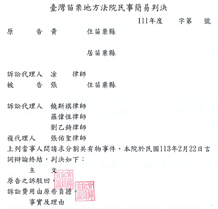 對造起訴主張:兩造為苗栗縣○○市○○段○○○○號建築物(門牌號碼苗栗縣○○市○○里○鄰○○路○○○○號;登記層次:1層、騎樓,總面積93.72平方公尺;主要用途:農舍)之共有人(應有部分權利範圍各二分之一),因系爭建物除原有所有權保存登記範圍以外,原告尚出資另於1樓屋前增建「加蓋鋼鐵造」棚架庭院、屋後「加蓋RC增建」庭院及2至4樓,而系爭建物之1樓設有前、後門而可分別獨立進出,且可透過於其中1樓之屋前「加蓋鋼鐵造」增建部分,再另行興建室內樓梯通往該建物之2至4樓,故應可認定1樓與其他各樓層均具構造上獨立性之建物,並無原物分配之困難。故請求以原物分割方式,將系爭建物中1樓之A部分及屋後加蓋RC增建部分,分歸被告所有;另第1層之B部分、屋前騎樓、加蓋鋼鐵造增建及2至4樓部分,則均分歸原告所有。若鈞院未採取上開原物分割方式,則請將系爭建物含增建部分均分配由原告單獨所有,並以金錢補償被告,或將上開共有物為變價分割。經當事人委託饒斯棋律師後,饒律師幫其主張: 依據農業發展條例第18條第4項、農業用地興建農舍辦法第12條第2項規定,系爭建物登記主要用途為農舍,應與其坐落基地併同移轉,無法獨立於土地之外單獨分割。且系爭建物坐落之農地存有套匯管制,未經解除套匯管制前,亦不得為原物分割,故系爭建物及坐落土地應屬民法第823條第1項規定所稱「除法令另有規定外」不得分割之情形,原告請求分割系爭建物於法不合,應予駁回。若法院認系爭建物無上開不得分割之限制情事存在,則因被告自系爭建物興建完成後迄今業已居住30餘年,而原告婚後經常在外花天酒地,時常無故離家,甚至於82年間即離家予其他女性同住在外迄今,多年未曾實際居住在系爭建物,均係由被告繳納系爭建物及坐落基地之相關稅捐。故被告對於系爭建物存有較高之經濟上、生活上及感情上之依存關係,則請求將系爭房屋全部分配予被告所有,並由被告以金錢補償原告,應屬較為公平適當之分割方法。經法院審理後認定: 又因系爭建物主要用途為農舍,其坐落之1762地號土地存有建築套匯管制迄未解除一節,亦據上開苗栗縣○○地政事務所函覆在案。而參酌農業用地興建農舍辦法第12條第2項規定:「已申請興建農舍之農業用地,直轄市、縣(市)主管建築機關應於地籍套繪圖上,將已興建及未興建農舍之農業用地分別著色標示,未經解除套繪管制不得辦理分割」,可知,於上開建築套匯管制解除前,1762地號自無從辦理分割,應屬民法第823條第1項所規定因法令另有規定而不得辦理分割情形。至上開農業用地興建農舍辦法第12條第2項規定內容,雖非直接針對農舍所為分割之限制,然依農業發展條例第18條第4項規定,農舍既應與其坐落用地併同移轉或併同設定抵押權,則農舍自應亦同受上開分割限制而不得請求分割。因之,原告請求單獨分割系爭建物,亦有違上開相關規定,而非有據。饒律師幫當事人取得勝訴判決。