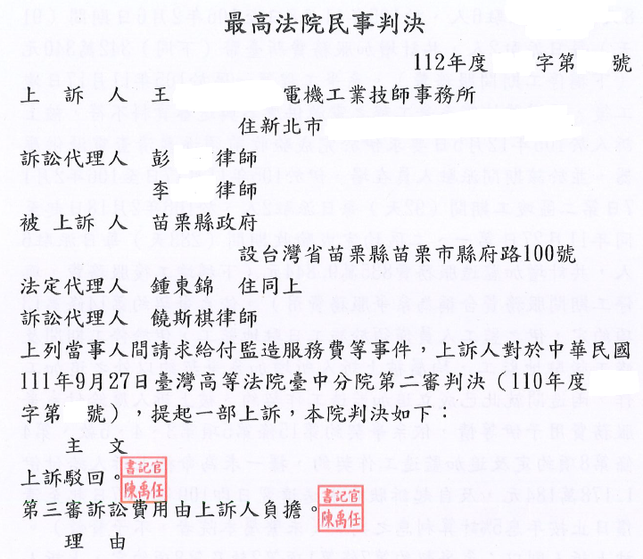 廠商起訴請求: 兩造於104年10月28日就縣府之「苗栗縣水銀路燈落日計畫案委託監造(含燈具設備諮詢)技術服務作業案」,簽立公共工程技術服務契約(下稱系爭契約),約定由伊執行上開計畫案第一區及第二區共18鄉鎮水銀路燈汰換為LED路燈工程(下稱系爭工程)之監造工作。伊於105年7月間因發現第一、二區鄉鎮市公所提報之汰換水銀路燈清冊與現地不符需進行清查確認,及卓蘭鎮公所A型架更換工程未完成而建請停工,經縣府同意後,第一、二區均於105年8月1日起停工,嗣依序於105年11月7日、106年2月6日復工。被上訴人要求伊於停工期間須於現場派駐監工,伊於105年8月1日至105年11月7日期間(98天)每日派駐6人、於105年11月8日至106年2月6日期間(91天)每日派駐2人,共計增加服務費新臺幣(下同)342萬340元(下稱停工期間服務費)。系爭工程第一區於105年11月17日竣工後,因媒體披露系爭工程之電源供應器與送審資料不符,縣府於105年12月5日要求伊於完成驗收前須逐盞清查電源供應器,並於該期間派駐人員在場,伊於105年11月17日至106年2月17日第二區竣工期間(92天)每日派駐2人、於106年2月18日起至同年11月27日第一、二區均完成驗收期間(283天)每日派駐6人,共計增加監造服務費835萬9,844元(下稱竣工後服務費,與停工期間服務費合稱為系爭服務費用)。依系爭契約第14條第13項約定,伊之監工人員僅須於施工日駐地監工,伊於停工期間及竣工後駐地監工,均屬縣府所增加系爭契約以外之追加工作,兩造間就此已成立追加監造工作契約,縣府應給付系爭服務費用予伊等情,依系爭契約第15條第5項第3、4、5款、第4條第8項約定及追加監造工作契約,擇一求為命縣府給付伊1,178萬184元,及自起訴狀繕本送達翌日即109年8月7日起至清償日止按年息5%計算利息之判決。經縣府委託饒斯棋律師後幫縣府抗辯: 系爭契約第7條第1項第2款及第8項約定,上訴人之監造服務責任係自簽訂契約日起至工程驗收合格止,並應於承包廠商開工之日起派專任監造人員至工地監工及派駐伊辦公室協助至驗收合格止,其駐地監工之責任未排除停工及竣工後至驗收完成前之期間。伊於系爭工程開工前即要求上訴人於開工後會同施工廠商清查水銀路燈盞數、燈桿是否完整及正確位置(下稱路燈清查作業),上訴人於開工超過8個月後始清查,並因此申請停工,停工原因應歸責於上訴人。上訴人於停工期間及竣工後派駐人員在場分別進行之路燈清查作業、電源供應器逐盞查證等工作,均屬原契約約定之工作範圍,非屬追加之工作,其不得請求伊給付系爭服務費用。二審判決:上訴人之監造責任包括監督、審查、督促施工廠商依送審計畫書或契約履約,且應持續至工程驗收合格為止,其派駐監造人員之義務,亦須至驗收合格、領取補助款完成為止。上訴人主張竣工後至驗收完成前之人員駐場費用,非系爭契約之範圍,屬追加工程費用,並無依據。系爭工程第一區於105年11月17日竣工,嗣新聞媒體於105年12月5日報導披露系爭工程施工廠商設置之路燈電源供應器與送審資料不符,被上訴人遂於106年1月5日、同年1月13日發函,要求上訴人就與契約不符之電源供應器拆除重作,應確實監造並逐盞查證;上訴人乃進行電源供應器之逐盞查證,清查後發現第一、二區共計有781個不良電源供應器,並督促廠商進行更換,於106年5月9日回報已逐盞清查完畢。上訴人於105年11月17日至106年5月9日期間所進行之電源供應器逐盞查證,應係履行其應盡之監造責任,屬系爭契約之工作範圍,非追加之工作;被上訴人亦無變更委託服務內容、契約執行涉及應執行其他之工作內容而未曾議定、要求增派超過契約原訂監造人員6人名額之人力等情事。上訴人請求被上訴人給付竣工後服務費835萬9,844元,亦屬無據。廠商不服二審判決經最高法院亦認定: 系爭工程之停工係因上訴人未依約於開工後儘速會同廠商辦理路燈清查作業,該停工係可歸責於上訴人,上訴人於停工期間仍須督促承攬廠商進行路燈清查作業;上訴人於竣工後派駐人員就電源供應器進行逐盞查證係履行其應負之契約義務,為原審合法確定之事實。則上訴人自不得就其於停工期間、竣工後期間所為之監造工作,請求縣府支付系爭服務費用。原審為上訴人敗訴之判決,經核於法並無違背。上訴論旨,指摘原判決違背法令,求予廢棄,非有理由。最後仍然維持縣府勝訴之判決。