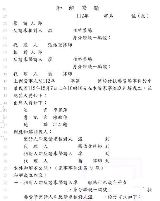 本件當事人主張對造離婚後未履行負擔未成年子女扶養、生活費用之義務,委請本事務所提告給付扶養費,經法院和解成立。
