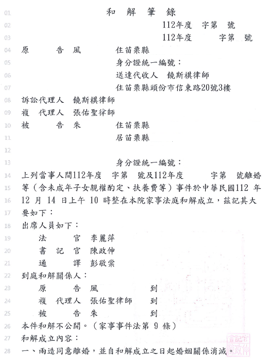 本件當事人主張對造有酗酒習慣,且經常無端辱罵、恐嚇當事人,甚至出手毆打當事人等家暴行為,委請本事務所提告離婚、子女監護權及扶養費,經法院和解離婚成立。