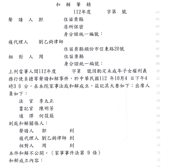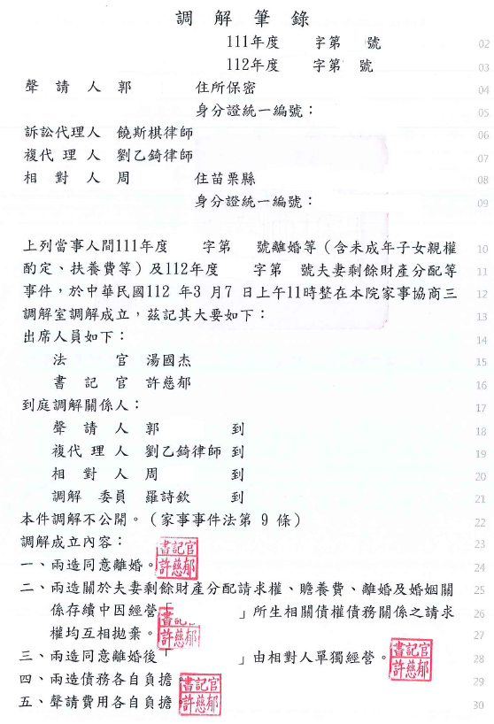 本件當事人主張與對造婚後因經濟、未成年子女教養問題爭執不斷,對造經常無端辱罵當事人甚至出手毆打當事人,當事人為子女長期隱忍,距料對造未停止家暴行為反而變本加厲,致當事人及子女持續生活在家庭暴力的恐懼之下,當事人因對造多次精神及慣性之肢體暴力等情,委請本事務所提告離婚、子女監護權及扶養費,經法院調解離婚成立,取得子女監護權,對造應給付扶養費用。