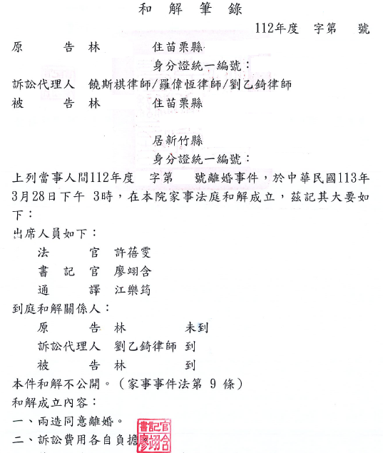 本件當事人主張對造婚後情緒控管能力欠佳,屢次當著未成年子女、當事人家人面前對當事人咆哮怒吼,亦屢次無端揣測當事人有不尋常交友之情事,並禁止當事人與異性友人之聯絡,侵害當事人意思自由及社交生活甚鉅造成原告精神痛苦等情事,委請本事務所提告離婚,經法院調解離婚成立。