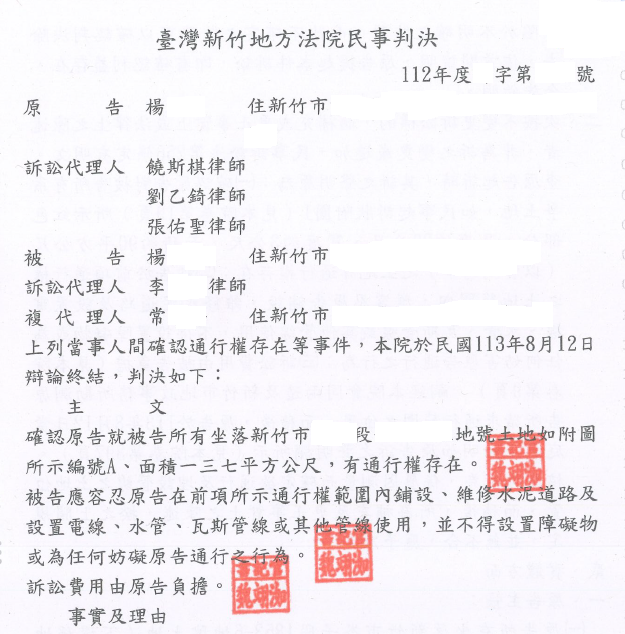 當事人因其所有土地,其上建有3層樓農舍及鐵皮屋,因未與聯外道路相通,且原告土地前方之系爭土地上,被告已興建房屋,原告必須藉由通行被告所有之系爭土地方能通抵000路000巷並連接000路000巷之道路,為此委任饒斯棋律師,饒律師幫其整理系爭土地歷次移轉資料、現場照片、空照圖、航照圖、現況圖及位置圖主張系爭土地確實係屬袋地,爰依民法第787條第1項、第788條第1項、第786條第1項規定提起訴訟,經法院審理後認定:「原告所有之土地為袋地,本件原告土地現況東、南側均為稻田,對外僅能自000號房屋前之系爭土地往東對外通行至000路000巷,而系爭土地除被告所有之000號房屋、附連主建物之雨遮及被告搭蓋之鐵皮屋等地上物,後段種植果樹外,其餘部分現為鋪設柏油路面作為私設道路使用,此有被告所提現場照片在卷為憑。據此,原告請求通行系爭土地前段之空地部分,本係鋪設柏油作為道路使用,若原告藉以劃設適當之範圍通行,則無須另外劃設新通路或施作額外工程,自得以最短之路線對外與000路000巷巷道聯絡,寬度3公尺亦符合現今一般車輛出入所需。」,而判決「確認原告就被告所有坐落新竹市○○段○○○○地號土地如附圖所示編號A、面積一三七平方公尺,有通行權存在。被告應容忍原告在前項所示通行權範圍內鋪設、維修水泥道路及設置電線、水管、瓦斯管線或其他管線使用,並不得設置障礙物或為任何妨礙原告通行之行為。」替當事人順利爭取得以通行之道路。