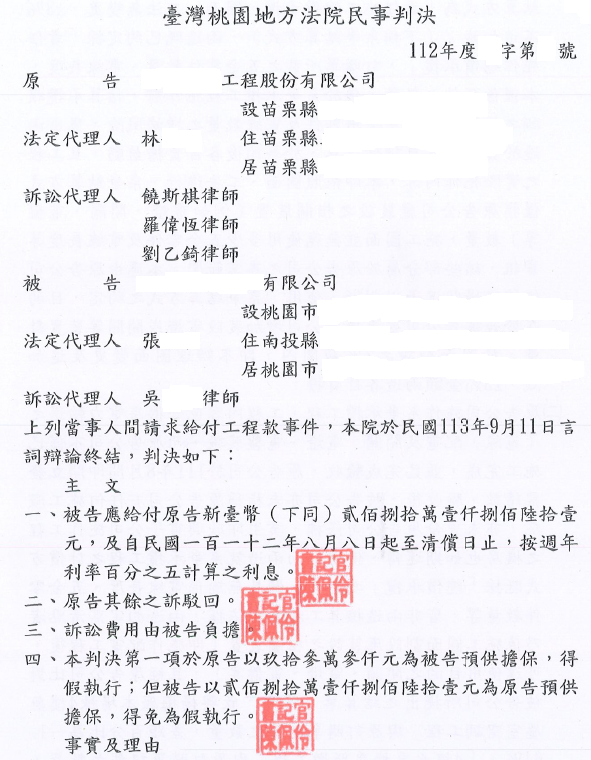 當事人因施作工程遭拒絕付款,到事務所委任饒律師,律師幫其主張:「原告公司承攬被告公司所發包無塵室空調工程(下稱系爭承攬工程),雙方於簽立訂購單時,約定結算方式為「責任施工總價承攬,圖面、工法無變更,±3%不追加減」(下稱系爭結算方式),兩造既已約定採「責任施作總價承攬」,訂購單所載之五金零件數量、電線長度,本僅係預估之數量,係於系爭承攬工程施作前,估算承攬報酬之依據,工程中使用零件及電線數量之增減風險,應由兩造於簽約前各自評估計算、於簽約後各自負擔盈虧,且工程之實際施作內容,本即依照圖面、工法進行,系爭結算方式僅指原告公司應裝設之相關裝置(例如電燈、開關、電盤等)數量,施工圖面並無應使用多少五金零件及電線長度等資訊,該些部分屬於原告公司之專業範圍,本應由原告公司依據現場狀況予以判斷、使用,系爭結算方式之約定,目的在於若被告公司要求原告公司增加裝設電燈或開關等裝置數量,於圖面劃設之3%範圍內,即不辦理圖面變更及追加減,±3%金額兩造各自負擔。原告公司不僅已施工完成,並已完成驗收,原告公司於111年8月間即開立發票請款,驗收後,被告公司亦未指稱原告公司有任何施工瑕疵,亦未曾命原告公司修補,業主之機房也如期運轉、使用,而兩造就系爭承攬工程之計價方式既採「總價承攬」之方式,顯見無論係電線長度、五金零件數量等,皆非兩造核算工程款之依據,兩造約定需清點者乃係施工圖面劃設應裝設之相關裝置(即施作配電工程後,可達使用目的之開關、電燈、電盤等),且經原告公司比對被告公司所提出之結算單,均未達應辦理追加減之3%,足認被告公司公司應依約定金額給付工程款。」經傳訊相關證人及調閱相關書圖、契約書後,法院判決當事人勝訴:「被告應給付原告貳佰捌拾萬壹仟捌佰陸拾壹元,及自民國一百一十二年八月八日起至清償日止,按週年利率百分之五計算之利息。」,饒律師事務所團隊幫當事人勝訴取得應得之金額。