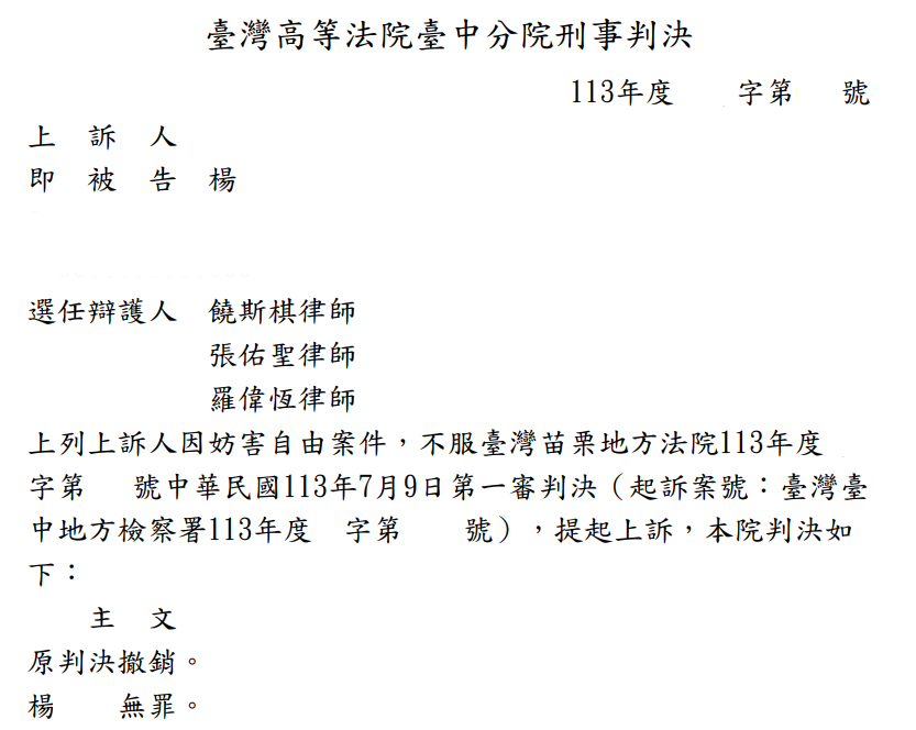 當事人遭檢察官起訴:「於民國112年7月26日18時許,在000內,被告因告訴人提出離職事宜而不悅,基於恐嚇之犯意,對告訴人稱:「妳不要再講了,我告訴妳,看我死還是妳死,我們倆沒完沒了,妳惹到我,我000,妳看我怎麼搞妳,妳在00在00在全台灣,妳看看我怎麼玩妳,搞妳!」等語,致告訴人心生畏懼,足生危害於安全。因認被告涉犯刑法第305條之恐嚇危害安全罪嫌。」,第一審因當事人自行開庭因不諳法律程序,遭法院判決「犯恐嚇危害安全罪,處拘役參拾日…」,當事人不服該判決,遂委任饒律師幫其上訴二審,經饒律師調閱卷宗並提出相關對話記錄等資料幫當事人辯護:「告訴人提出離職說要112年8月30日為最後上班日,卻突然在112年7月26日晚上6點左右,在其非當班時間闖入診間,告訴人跟被告說當天他就要離職,被告因為需要看診及休息故,請告訴人離開,告訴人堅持不離開,後來告訴人就向被告說如果被告不讓他今天離職,他就要到衛生局、勞動部及法院對被告提告,被告才會回答說:如果要告,就大家來告,才會有附件勘驗筆錄所載錄音,告訴人進入診間至離開將近1小時,附件錄音卻只有1分多鐘,對於整個的來龍去脈都沒有提出完整的錄音;且後來報案,依警察職務報告載明現場詢問雙方皆表示不需要警方協助,確認現場並無急迫危險也無不法情事,警察就離開,如果當下被告有任何的恐嚇行為,衡諸常情,既然警察都到場,告訴人應該會直接向警察表明要提出告訴,告訴人遲至112年8月8日以書狀提出告訴,怎麼有心生畏懼情況。綜上可證,被告所為的陳述確實是針對告訴人要對被告提出檢舉及告訴而為的回應,並沒有任何恐嚇告訴人的犯意,請求對被告為無罪的諭知等語」,最終法官採認上開辯護,由二審法院撤銷改判,並為當事人無罪之判決,還當事人清白。