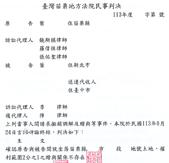 當事人因與孫女之法院調解筆錄記載將其名下土地無償贈與給孫女,惟,當事人自始稱非其本意,遂委請饒律師幫其主張權益,饒律師幫其起訴主張:「兩造尚未達成贈與合意、有民法第88條第1項、第92條第1項規定,主張原告贈與被告間所有權移轉登記事件調解應予撤銷,原告就系爭土地尚未移轉登記予被告,原告仍為系爭土地之所有權人,就兩造間於112年9月12日所成立之系爭調解,身為祖母即原告係無償贈與其孫女即被告,並未經公證,亦非履行道德上之義務,又如前述已確定兩造間就系爭土地有贈與法律關係存在之效力,應屬民法第408條第1項所定「贈與物之權利未移轉前」,嗣經聲請調閱相關資料及傳訊證人後,法院判決認定:「被告應知悉原告之戶口名薄係由其父保管,原告於系爭所有權移轉登記事件訴訟調解期間,不僅主觀上並無久住淡水區或松山區地址之意思,客觀上亦無居住淡水區或松山區地址之事實,是本件系爭調解筆錄對原告自始從未居住之淡水區或松山區之地址為送達,自不生合法送達之效力」、「原告就系爭土地尚未移轉登記予被告,原告仍為系爭土地之所有權人,就兩造間於112年9月12日所成立之系爭調解,身為祖母即原告係無償贈與其孫女即被告,並未經公證,亦非履行道德上之義務,又如前述已確定兩造間就系爭土地有贈與法律關係存在之效力,應屬民法第408條第1項所定「贈與物之權利未移轉前」之情。因此原告為被告之祖母,原告與被告間均無互負扶養之義務,本件並非屬經公證或具有履行道德上義務情事之贈與,是本件之贈與人(即原告)在贈與物之權利移轉予受贈人(即被告)前,自得依民法第408條第1項之規定行使任意撤銷權,撤銷本件贈與」從而法官判決當事人勝訴:「確認原告與被告間就坐落苗栗縣○○市○○段000地號土地,權利範圍2分之1之贈與關係不存在。」,順利幫當事人保住財產。