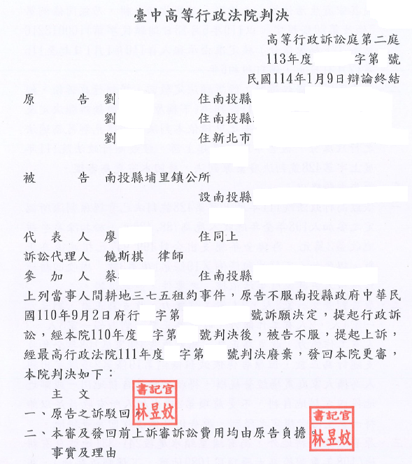 出租人所有坐落南投縣埔里鎮耕地(下稱系爭耕地)與參加人000有私有耕地租約書,最近一次租期於109年12月31日期滿。嗣出租人以擴大農場經營規模為由,於110年1月21日申請收回自耕(下稱系爭申請案),參加人亦於同年1月18日申請續訂租約。經南投埔里鎮公所審查結果,認系爭耕地有耕地三七五減租條例(下稱減租條例)第19條第1項第3款所定「出租人因收回耕地,致承租人失其家庭生活依據」之情形,不得收回自耕,乃依同條例第5條及第20條規定,以原處分核定准由承租人自110年1月1日起至115年12月31日止,續訂租約6年。出租人不服,提起訴願,經訴願決定駁回,提起行政訴訟,經台中高等行政法院110年度0字第000號判決(下稱原判決)撤銷訴願決定及原處分,南投埔里鎮公所應就出租人之申請依本判決之法律見解另為適法之行政處分。南投埔里鎮公所不服,委託饒斯棋律師提起上訴,經最高行政法院111年度0字第000號判決廢棄原判決,發回台中高等行政法院更為審理。經南投埔里鎮公所委託饒斯棋律師,饒律師依據最高行政法院發回意旨及提出相關判決主張:「出租人不符合減租條例第19條第2項收回系爭耕地之要件:(一)依最高行政法院111年度0字第000號判決發回意旨及內政部79年8月31日台內地字第828311號函,出租人依減租條例第19條第2項規定,申請收回與其自耕地同一或鄰近地段內之耕地,此所謂之「自耕地」,雖不以出租人單獨所有之耕地為限,尚包括與其他人共有者,然須出租人實際於該處從事農業經營,始與減租條例第19條第2項所稱「擴大家庭農場經營規模」之意旨相當。(二)原告雖以自有鄰近耕地及出租人之一岳父母耕地,主張有自任耕作之事實,惟查鎮公所於前審審理中於111年3月10日派員實地勘查,該鄰近耕地與系爭耕地間距離約14公里,經實地勘查及調閱105年6月9日之航照圖顯現,鄰近耕地上現為農路、工寮、排水溝渠等,並無擴大家庭農場經營規模跡象。再於113年6月7日派員至鄰近耕地現勘結果亦為「現況為既有的舊工寮堆置農作箱子及肥料袋,周圍有野生雜草、野生芒草之情形,並無農業經營之跡象。」此有勘查紀錄表及照片可稽。另其岳父母耕地,在原處分作成時,並非出租人所有,不符減租條例第19條第2項收回要件。」經法判決採信並認定並未符合第19條第2項「擴大家庭農場經營規模」之積極要件,出租人據以申請收回系爭耕地,並無理由,原處分准予參加人續訂租約,並無違誤。訴願決定予以維持,亦無不合,原告訴請撤銷,並無理由,而為南投埔里鎮公所勝訴之判決。