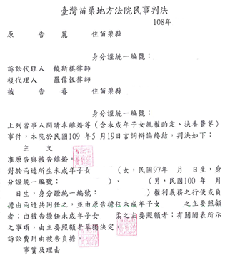 本案當事人因有遭受到家暴及配偶有不負扶養義務之情事,委請本事務所提告離婚,經法院判決准予離婚,當事人並一併取得未成年子女監護權,及對方應給付扶養費用。